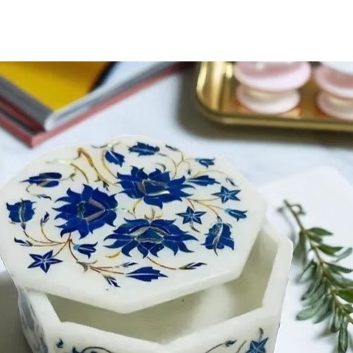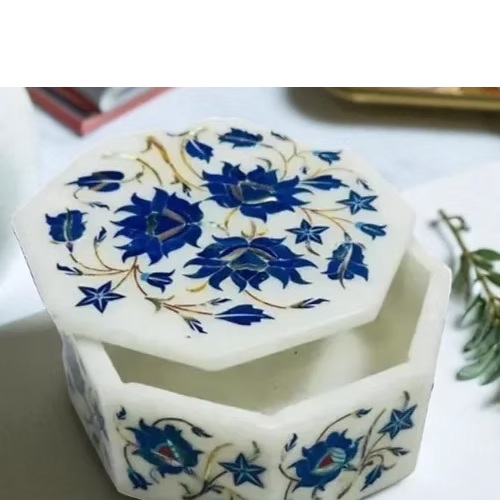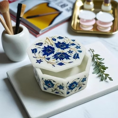 Handcrafted white marble jewelry box with floral Lapis Lazuli inlay. Elegant, durable, and perfect for storing precious jewelry or keepsakes.