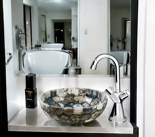 Handmade Natural Agate Stone Sink – Unique stone patterns with a polished finish, perfect for luxury bathroom vanities, countertops, and designer interiors.