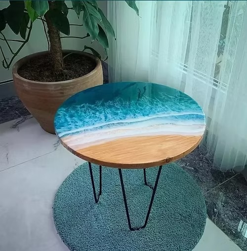 Design: Round, live edge, ocean-inspired resin top