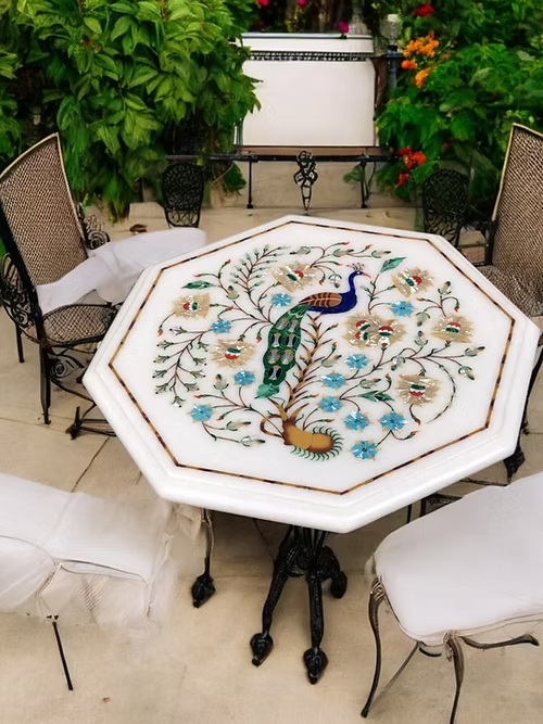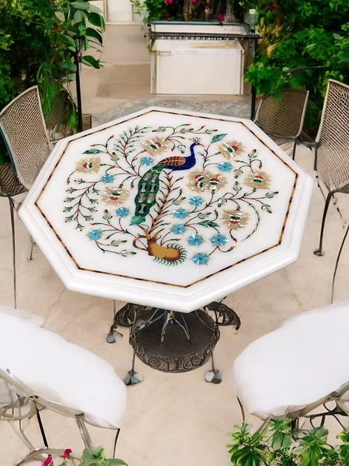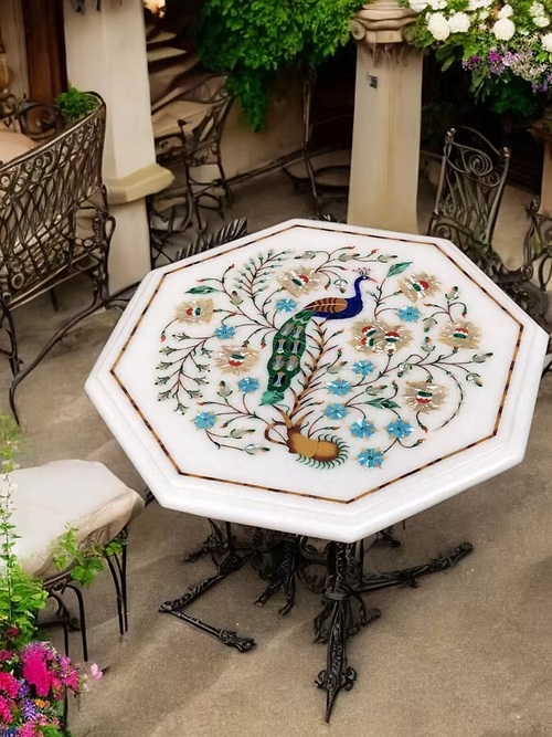White Marble Inlay Coffee Table – Floral Peacock Design Marquetry Fine Art