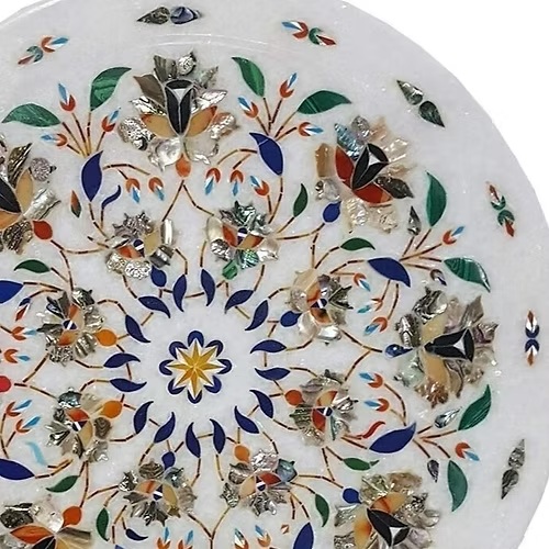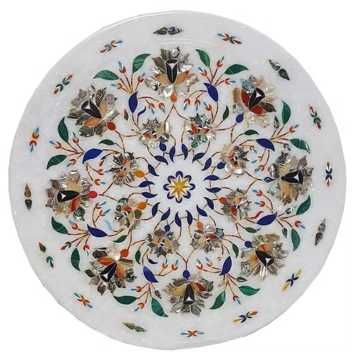 Elevate your home décor with this luxurious handmade white marble inlay table top, featuring semi-precious multi-gemstone accents. Each piece is meticulously crafted to showcase unique patterns and vibrant colors, making every table a one-of-a-kind masterpiece. Perfect as a coffee table centerpiece, this table top adds artisanal elegance and luxury to your living room, lounge, or home interior.